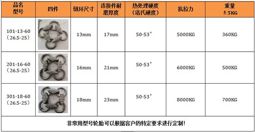 保養(yǎng)鏈耐磨性好,抗疲勞性強(qiáng),根據(jù)使用條件壽命達(dá)3000-8000小時。拆裝方便,省時省力,產(chǎn)品規(guī)格齊全,可與進(jìn)口裝載機(jī)所匹配,輪胎保護(hù)鏈,采用高科技耐磨材料制成其結(jié)構(gòu)新穎緊湊,性能穩(wěn)定,主要適用于礦山作業(yè)的裝載機(jī),其輪胎磨損快,使用壽命短,輪胎價格昂貴,使用成本高,將本產(chǎn)品嚴(yán)密的包裹在裝載機(jī)的輪胎上,可以有效的保護(hù)裝載機(jī)的輪胎,不被尖銳的石塊劃傷刺破,延長了輪胎的使用壽命,使用一條輪胎保護(hù)鏈,能節(jié)省十條輪胎以上的費(fèi)用還能提高裝載機(jī)的工作效率和安全是礦山作業(yè)的必備品。
